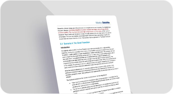 Meanwhile, climate change and other pressures on ecological services are increasing, thus highlighting a long-term dilemma. Increasing competition to provide resources and higher-carbon energy will drive sustained volatility. This may even drive some high-cost producers out of the market. As the “curse of resources” theory points out, few places manage this well, preferring the short-term profit at the expense of the future. The eventual solution: a sovereign wealth fund which takes a percentage of profits and invests them into future industries. In fact, this scenario may be a precursor to “The Great Transition”. 5.4 Scenario 4: The Great Transition Introduction As originally written in 2010, the Great Transition was seen as a scenario with a rough and risky beginning, leading into a paradigm shift in terms of how wealth is perceived by people around the world. In addition, a rapid transition to a post-industrial/post-carbon model takes place. This paradigm shift was seen to result from the world “hitting rock bottom” due to a rapid move to a post-carbon economy and a new world order. New global leadership was established and new metrics for prosperity were institutionalized (the triple bottom line) with a change in how Wall Street measures prosperity. This impacted business models around the world driving net reductions in trade. While there are many losers in this scenario, the gateway is seen as a winner because of its superior competitiveness coming from early investments in low-carbon and sustainable supply chain practices and industrial operations. While the notion of altruism was not expressly stated as a key component of this scenario, many participants believed it came out in the previous narrative as a key reason for the transition to an alternative prosperity model. Many participants also expressed that any transition would not be so fast or turbulent. The feedback received on this scenario revolved around the following themes: • There must be strong economic incentives to drive change and reform. It is not likely that the world will shift to a different Global Prosperity Model for altruistic reasons, as economic realities will always be a primary factor in decision making. • The fast rate at which the energy transition takes place in this scenario was questioned and participants believed it would be more gradual given that it is already occurring (e.g. carbon taxes). • Trade and prosperity were seen to go hand in hand; Participants found it difficult to envision a model where trade decreases while prosperity increased. • In order to precipitate a move toward an alternate prosperity model, there would have to be some major events which shock the world into action and greater clarity around what those events would be is necessary. Summary of Updates The Great Transition scenario has been changed more than the other scenarios due to the fundamental nature of the considerations raised by participants and the variations in the Global Prosperity Model axis. While there is still a transition to an alternative prosperity model during the scenario, it is framed as more of an inflection point than the world “hitting rock bottom”. The levels of economic and geo-political volatility surrounding the transition have been clarified and this, coupled with significant human and climate-change driven catastrophes motivate an aligned response from key countries. The events described precipitate an increased focus on environmental sustainability and governments start to more rapidly introduce legislation and regulation to achieve outcomes related to environmental sustainability and human well-being. There is also a greater focus on cost of production measures that begin to include consideration of these factors. The rate at which this change occurs Port 2050 Scenario Update Initiative - 2015 29