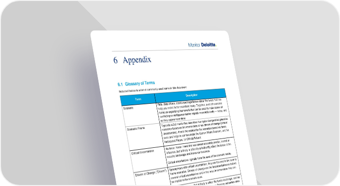 6 Appendix 6.1 Glossary of Terms Included below is a list of commonly used terms in this document: Term Description Scenario Rich, data-driven, stories and hypotheses about the future that can help you make better decisions today. Together, a set of scenarios forms an organizing framework that can be used to make sense of conflicting or ambiguous market signals more holistically — today, and as they appear over time Scenario Frame Typically a 2x2 matrix that describes four quite divergent but plausible scenarios based on the intersection of two drivers of change (Critical Uncertainties). It sets the context for the scenarios based on those axes and helps to communicate the Current World Scenario, and the Anticipated Future (or Official Future) Critical Uncertainties An issue / force / trend that we cannot accurately predict, control or influence, but is likely to (directly or indirectly) affect the future of the industry landscape and hence our business Critical uncertainties typically form the axes of the scenario matrix. Drivers of Change (“Drivers”) Synonymous with critical uncertainties, they can be used in the axes to frame scenarios. Drivers of change are the fundamental levers behind several critical uncertainties and in that way, in some cases they can be implicit in the scenario axes. Relative Certainties An issue/force/trend that is likely to affect the future landscape, and we are relatively clear about how it will play out. Relative certainties often act as the strategic assumptions by which scenario and strategic planning are performed. Early Warning Indicators Events that are considered to be indicators or ‘guide posts’ for how a particular scenario may be unfold, such as what one may read in newspaper headlines that correspond with the changes described as part of a scenario. Early warning indicators are typically identified for all scenarios in a matrix in case an alternative future to what is anticipated starts to unfold. Current World Scenario The scenario in the Scenario Matrix that stakeholders believe is the one in which Port Metro Vancouver currently exists. This helps to frame the strategic shifts that an organization may need to make as it considers the world moving from where it is today, to an anticipated future. Port 2050 Scenario Update Initiative - 2015 33