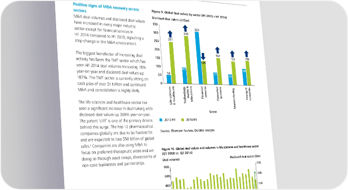 6 | The Deloitte M&A Index Q3 2014 7 | Sectors Positive signs of M&A recovery across Figure 9. Global deal values by sector (H1 2013 v H1 2014) sectors Disclosed deal values (US$bn) M&A deal volumes and disclosed deal values 350 have increased in every major industry 323 sector except for financial services in 300 293 H1 2014 compared to H1 2013, signalling a 250 251 step‑change in the M&A environment. 200 167 158 The biggest benefactor of increasing deal 150 151 activity has been the TMT sector which has 145 seen H1 2014 deal volumes increasing 18% 100 102 106 year‑on‑year and disclosed deal values up 50 53 77 69 187%. The TMT sector is currently sitting on cash piles of over $1 trillion and continued 0 & & M&A and consolidation is highly likely. media FinancialservicesConsumerbusiness Energy resources The life sciences and healthcare sector has Life sciences& healthcareTechnology,telecomms seen a significant increase in dealmaking with Manufacturing disclosed deal values up 369% year‑on‑year. Sector The patent ‘cliff’ is one of the primary drivers 2013 H1 2014 H1 behind this surge. The top 12 pharmaceutical companies globally are due to be hardest hit Source: Thomson Reuters; Deloitte analysis and are expected to lose $50 billion of global 1 sales. Companies are also using M&A to focus on preferred therapeutic areas and are Figure 10. Global deal values and volumes in life sciences and healthcare sector doing so through asset swaps, divestments of (Q1 2008 vs. Q2 2014) non‑core businesses and partnerships. Deal volumes Disclosed deal values ($bn) 600 250 500 200 400 150 300 0 10 200 100 50 - 0 2008 Q12008 Q22008 Q32008 Q42009 Q12009 Q22009 Q32009 Q42010 Q12010 Q22010 Q32010 Q42011 Q12011 Q22011 Q32011 Q42012 Q12012 Q22012 Q32012 Q42013 Q12013 Q22013 Q32013 Q42014 Q12014 Q2 Quarter Deal volumes Disclosed deal values ($bn) Source: Thomson Reuters; Deloitte analysis 1 Evaluate, Evaluate Pharma World Preview 2013