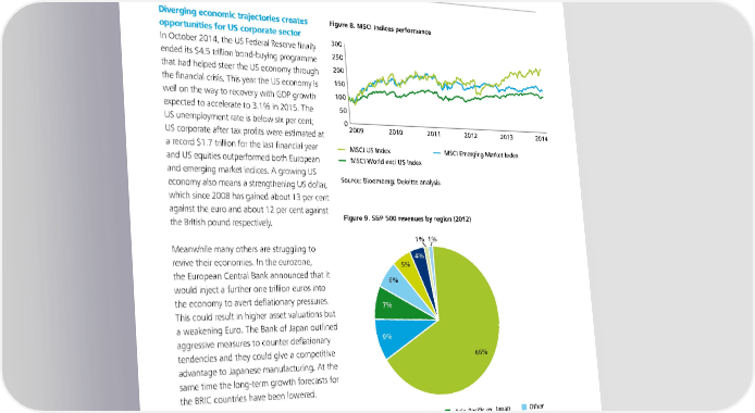 5 | The Deloitte M&A Index Q4 2014 Factors set to influence M&A in 2015 Diverging economic trajectories creates Figure 8. MSCI Indices performance opportunities for US corporate sector In October 2014, the US Federal Reserve finally 300 ended its $4.5 trillion bond-buying programme 250 that had helped steer the US economy through 200 the financial crisis. This year the US economy is 150 well on the way to recovery with GDP growth 100 expected to accelerate to 3.1% in 2015. The 50 US unemployment rate is below six per cent; 0 US corporate after tax profits were estimated at 2009 2010 2011 2012 2013 2014 a record $1.7 trillion for the last financial year MSCI US Index MSCI Emerging Market Index and US equities outperformed both European MSCI World excl US Index and emerging market indices. A growing US economy also means a strengthening US dollar, Source: Bloomberg; Deloitte analysis which since 2008 has gained about 13 per cent against the euro and about 12 per cent against the British pound respectively. Figure 9. S&P 500 revenues by region (2012) 1% 1% Meanwhile many others are struggling to revive their economies. In the eurozone, 4% 5% the European Central Bank announced that it 6% would inject a further one trillion euros into the economy to avert deflationary pressures. 7% This could result in higher asset valuations but a weakening Euro. The Bank of Japan outlined aggressive measures to counter deflationary 9% tendencies and they could give a competitive 66% advantage to Japanese manufacturing. At the same time the long-term growth forecasts for the BRIC countries have been lowered. S&P 500 companies in 2012 earned around US Other EMEA Asia-Paciļ¬c ex. Japan Other 34 per cent of their revenues from overseas. Other Americas Western Europe South America Japan With such a significant amount of turnover coming from countries experiencing a slow Source: Goldman Sachs Global ECS research recovery, US companies may come under pressure to grow their revenues elsewhere. The stronger dollar and strength of their share prices presents an opportunity for US companies to do more cross-border M&A deals. In the coming year we should expect to see an increase in cross-border transactions, particularly from the US into Europe.