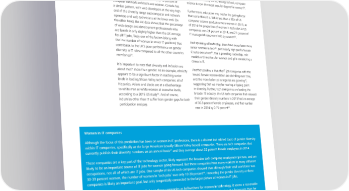The percentage of women in IT varies significantly Although some of the numbers on gender diversity in by specialization and that variation also varies by IT may appear disappointing, there are also hopeful country. As an example, in the US over 35 percent of signs. At one leading US technology school, computer 39 web developers are female, while only 12 percent of science is now the most popular degree for women . computer network architects are women. Canada has a similar pattern, with web developers at the very high Furthermore, education may not be the gating factor end of the diversity range and computer and network that some think it is. While less than a fifth of US operators and web technicians at the lower end. On computer science graduates were women in 2013, as the other hand, the UK data shows that the percentage of 2014 the proportion of women in tech roles in US of web design and development professionals who companies was 24 percent in 2014, and 27 percent of 40 are female is only slightly higher than the UK average IT managerial roles were held by women . for all IT jobs, likely one of the factors (along with the low number of women in senior IT positions) that And speaking of leadership, there have never been more 41 contributes to the UK’s poor performance on gender senior women in tech , particularly high-profile female 42 diversity in IT roles compared to all the other countries C-suite executives : this is providing leadership, role 35 models and mentors for women and girls considering a mentioned . career in IT. It is important to note that diversity and inclusion are about much more than gender. As an example, ethnicity Another positive is that the IT job categories with the appears to be a significant factor in reaching senior lowest female representation are shrinking over time, levels in leading Silicon Valley tech companies: all of and the more balanced categories are growing43, Hispanics, Asians and blacks are at a disadvantage suggesting that we may be nearing a tipping point to white men or white women at executive levels, in diversity. Further, tech companies are leading the 36 broader IT industry: the US tech companies that released according to a 2015 US study . And of course, industries other than IT suffer from gender gaps for both their gender diversity numbers in 2013 had an average participation and pay. of 30.3 percent female employees, and that number 44 rose in 2014 by 0.15 percent . Women in IT companies Although the focus of this prediction has been on women in IT professions, there is a distinct but related topic of gender diversity within IT companies, specifically at the large American (usually Silicon Valley-based) companies. There are tech companies that 37 currently publish their diversity numbers on an annual basis and they average about 32 percent female employees in 2014. These companies are a key part of the technology sector, likely represent the broader tech company employment picture, and are likely to be an important source of IT jobs for women going forward. But these companies have many workers in many different occupations, not all of which are IT jobs. One sample of six US tech companies showed that although their total workforce was 38 30-39 percent women, the number of women in ‘tech jobs’ was only 10-20 percent . Increasing the gender diversity at these companies is likely an important goal, but only tangentially connected to the larger picture of women in IT jobs. Because of the considerable public spotlight on these companies as bellwethers for women in technology, it seems a reasonable prediction that the gender diversity numbers at high-profile publicly traded companies are likely to rise at a faster rate than for women in IT functions or jobs. Therefore it will be important to recognize that even if some Silicon Valley companies have 50 percent female employees that may not mean that the diversity of women in IT jobs across the US or developed countries in general has improved to the same extent. 6