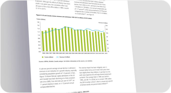 As stated previously, between 1995 and 2015 annual A chart of box office revenues in constant dollars and revenues for the US and Canadian box office (called also the number of tickets sold shows a clear picture: the North American box office by the movie industry, both admissions and constant dollar revenues grew from although it does not include Mexico) fluctuated in 1995 to 2002, and since then both inflation-adjusted a relatively narrow range of up 10 percent and down revenues and admissions have fluctuated, but are in slow 6 percent. Although the effects of inflation have been decline. From 2002 to 2015, admissions have fallen from small in any given year, the cumulative effect over 1.55 billion to 1.33 billion, or an annual compounded rate 192 20 years is that a box office dollar in 1995 is worth of 1.17 percent , while revenues declined at a 0.79 percent $1.57 in 2015. compound rate in constant 2014 dollars, from $12.03 billion 193 to $10.85 billion , see Figure 9. Figure 9: US and Canada cinema revenues and admissions 1995‑2015 in billions of 2014 dollars Tickets (billion) Revenue ($ billion) 1.8 $14 1.6 $12 1.4 $10 1.2 1.0 $8 0.8 $6 0.6 $4 0.4 0.2 $2 0.0 $0 19951996199719981999200020012002200320042005200620072008200920102011201220132014 2015 Tickets (billion) Revenue ($ billion) Sources: MPAA, Deloitte Canada analysis. For further information on the sources, see endnotes. A sub-one percent average annual decline in admission The revenue impact has been mitigated, even in revenues is not indicative of a growth industry, especially constant dollar terms, as US movie ticket prices have considering population growth of 1-2 percent. In fact, risen slightly faster than inflation, in part due to a mix Figure 10 shows that per capita admissions in the US with more expensive 3D and large format movies (such and Canada have been declining at a fairly consistent as IMAX). The average ticket in 1995 was $4.59 in 194 rate since 2005, from 4.4 visits per year to 3.9 : an 1995, and $8.17 in 2014, but in constant 1995 dollars 11 percent decline in total, or a 1.2 percent annual the 2014 number is $5.27, which is annual price growth 195 compounded decline. of almost exactly one percent above inflation . Figure 10: US and Canada tickets per capita for population aged 2+, 2005‑2015 Tickets per capita 6 5 4.4 4.4 4.4 4.2 4.3 4.1 4.1 3.9 4.0 3.9 4 3.7 3 2 1 0 2005 2006 2007 2008 2009 2010 2011 2012 2013 2014 2015 Sources: MPAA, Deloitte Canada analysis. For further information on the sources, see endnotes. Technology, Media & Telecommunications Predictions 2016 31