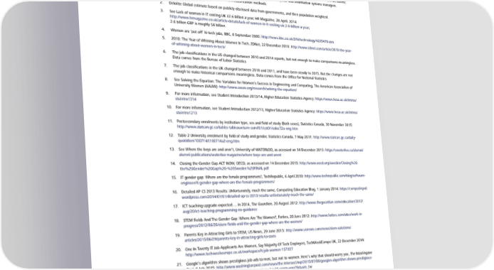 Endnotes 1. This category refers to the professions identified by governments in the US, U.K., Canada, and Sweden. The US list of professions is: Computer programmers; Software developers, applications and systems software; Web developers; Computer support specialists; Database administrators; Network and computer systems administrators; Computer network architects; Computer occupations, all other; Computer hardware engineers; and Computer and information systems managers. Other countries have similar but different classification methods. 2. Deloitte Global estimate based on publicly-disclosed data from governments, and then population weighted. 3. See Lack of women in IT costing UK £2.6 billion a year, HR Magazine, 28 April, 2014: http://www.hrmagazine.co.uk/article-details/lack-of-women-in-it-costing-uk-2-6-billion-a-year; 2.6 billion GBP is roughly $4 billion. 4. Women are ‘put off’ hi-tech jobs, BBC, 8 September 2005: http://news.bbc.co.uk/2/hi/technology/4225470.stm 5. 2010: The Year of Whining About Women In Tech, ZDNet, 22 December 2010: http://www.zdnet.com/article/2010-the-year- of-whining-about-women-in-tech/ 6. The job classifications in the US changed between 2010 and 2014 reports, but not enough to make comparisons meaningless. Data comes from the Bureau of Labor Statistics 7. The job classifications in the UK changed between 2010 and 2011, and have been steady to 2015. But the changes are not enough to make historical comparisons meaningless. Data comes from the Office for National Statistics 8. See Solving the Equation: The Variables for Women’s Success in Engineering and Computing, The American Association of University Women (AAUW): http://www.aauw.org/research/solving-the-equation/ 9. For more information, see Student Introduction 2013/14, Higher Education Statistics Agency: https://www.hesa.ac.uk/intros/ stuintro1314 10. For more information, see Student Introduction 2012/13, Higher Education Statistics Agency: https://www.hesa.ac.uk/intros/ stuintro1213 11. Postsecondary enrolments by institution type, sex and field of study (Both sexes), Statistics Canada, 30 November 2015: http://www.statcan.gc.ca/tables-tableaux/sum-som/l01/cst01/educ72a-eng.htm 12. Table 2 University enrolment by field of study and gender, Statistics Canada, 7 May 2011: http://www.statcan.gc.ca/daily- quotidien/100714/t100714a2-eng.htm 13. See Where the boys are and aren’t, University of WATERLOO, as accessed on 14 December 2015: https://uwaterloo.ca/alumni/ alumni-publications/waterloo-magazine/where-boys-are-and-arent 14. Closing the Gender Gap ACT NOW, OECD, as accessed on 14 December 2015: http://www.oecd.org/sweden/Closing%20 the%20Gender%20Gap%20-%20Sweden%20FINAL.pdf 15. IT gender gap: Where are the female programmers?, TechRepublic, 6 April 2010: http://www.techrepublic.com/blog/software- engineer/it-gender-gap-where-are-the-female-programmers/ 16. Detailed AP CS 2013 Results: Unfortunately, much the same, Computing Education Blog, 1 January 2014: https://computinged. wordpress.com/2014/01/01/detailed-ap-cs-2013-results-unfortunately-much-the-same/ 17. ICT teaching upgrade expected … in 2014, The Guardian, 20 August 2012: http://www.theguardian.com/education/2012/ aug/20/ict-teaching-programming-no-guidance 18. STEM Fields And The Gender Gap: Where Are The Women?, Forbes, 20 June 2012: http://www.forbes.com/sites/work-in- progress/2012/06/20/stem-fields-and-the-gender-gap-where-are-the-women/ 19. Parents Key in Attracting Girls to STEM, US News, 29 June 2015: http://www.usnews.com/news/stem-solutions/ articles/2015/06/29/parents-key-in-attracting-girls-to-stem 20. One In Twenty IT Job Applicants Are Women, Say Majority Of Tech Employers, TechWeekEurope UK, 22 December 2014: http://www.techweekeurope.co.uk/workspace/it-job-women-157937 21. Google’s algorithm shows prestigious job ads to men, but not to women. Here’s why that should worry you, The Washington Post, 6 July 2015: http://www.washingtonpost.com/news/the-intersect/wp/2015/07/06/googles-algorithm-shows-prestigious- job-ads-to-men-but-not-to-women-heres-why-that-should-worry-you/?tid=sm_tw 22. How stereotypes impair women’s careers in science: http://www.pnas.org/content/111/12/4403.abstract 23. Guide: Raise awareness about unconscious bias, re:Work: https://rework.withgoogle.com/guides/unbiasing-raise-awareness/ steps/introduction/ 24. The resume gap: Are different gender styles contributing to tech’s dismal diversity?, Fortune, 26 March 2015: http://fortune. com/2015/03/26/the-resume-gap-women-tell-stories-men-stick-to-facts-and-get-the-advantage/ 25. Keeping women in high-tech fields is big challenge, report finds, The Washington Post, 12 February 2014: http://www.washingtonpost.com/business/economy/keeping-women-in-high-tech-fields-is-big-challenge-report- finds/2014/02/12/8a53c6ac-93fe-11e3-b46a-5a3d0d2130da_story.html 26. Women Are Leaving Science And Engineering Jobs In Droves, ThinkProgress, 13 February 2014: http://thinkprogress.org/ economy/2014/02/13/3287861/women-leaving-stem-jobs/ and Women’s Progress In Science And Engineering Jobs Has Stalled For Two Decades, ThinkProgress, 10 September 2013: http://thinkprogress.org/economy/2013/09/10/2599491/women-stem/ 62