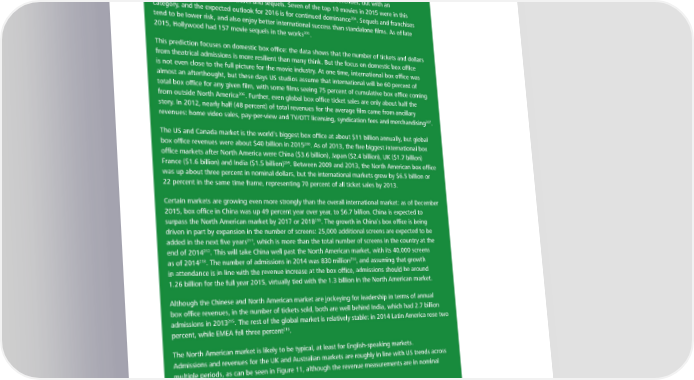 Bottom Line Spending on making movies should assume flat-to-down theatrical revenues, but with an ever-increasing focus on franchises and sequels. Seven of the top 10 movies in 2015 were in this 204. Sequels and franchises category, and the expected outlook for 2016 is for continued dominance tend to be lower risk, and also enjoy better international success than standalone films. As of late 205. 2015, Hollywood had 157 movie sequels in the works This prediction focuses on domestic box office: the data shows that the number of tickets and dollars from theatrical admissions is more resilient than many think. But the focus on domestic box office is not even close to the full picture for the movie industry. At one time, international box office was almost an afterthought, but these days US studios assume that international will be 60 percent of total box office for any given film, with some films seeing 75 percent of cumulative box office coming from outside North America206. Further, even global box office ticket sales are only about half the story. In 2012, nearly half (48 percent) of total revenues for the average film came from ancillary 207 revenues: home video sales, pay-per-view and TV/OTT licensing, syndication fees and merchandising . The US and Canada market is the world’s biggest box office at about $11 billion annually, but global 208 box office revenues were about $40 billion in 2015 . As of 2013, the five biggest international box office markets after North America were China ($3.6 billion), Japan ($2.4 billion), UK ($1.7 billion) 209 France ($1.6 billion) and India ($1.5 billion) . Between 2009 and 2013, the North American box office was up about three percent in nominal dollars, but the international markets grew by $6.5 billion or 22 percent in the same time frame, representing 70 percent of all ticket sales by 2013. Certain markets are growing even more strongly than the overall international market: as of December 2015, box office in China was up 49 percent year over year, to $6.7 billion. China is expected to 210. The growth in China’s box office is being surpass the North American market by 2017 or 2018 driven in part by expansion in the number of screens: 25,000 additional screens are expected to be added in the next five years211, which is more than the total number of screens in the country at the end of 2014212. This will take China well past the North American market, with its 40,000 screens 213 214 as of 2014 . The number of admissions in 2014 was 830 million , and assuming that growth in attendance is in line with the revenue increase at the box office, admissions should be around 1.26 billion for the full year 2015, virtually tied with the 1.3 billion in the North American market. Although the Chinese and North American market are jockeying for leadership in terms of annual box office revenues, in the number of tickets sold, both are well behind India, which had 2.7 billion 215. The rest of the global market is relatively stable: in 2014 Latin America rose two admissions in 2013 216. percent, while EMEA fell three percent The North American market is likely to be typical, at least for English-speaking markets. Admissions and revenues for the UK and Australian markets are roughly in line with US trends across multiple periods, as can be seen in Figure 11, although the revenue measurements are in nominal dollars rather than constant dollars. Technology, Media & Telecommunications Predictions 2016 33