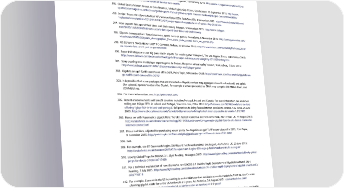 293. Cineplex buys into future of eSports, forming competitive video-game league, The Globe and Mail, 17 September 2015: http://www.theglobeandmail.com/technology/tech-news/cineplex-buys-into-future-of-esports-forming-competitive-video- game-league/article26401328/ 294. UK’s first eSports arena opens in London next month, Eurogamer, 18 February 2015: http://www.eurogamer.net/articles/2015- 02-18-uks-first-esports-arena-opens-in-london-next-month 295. Global Sports Market Grows as Gate Revenue, Media Rights Gap Closes, Sportscaster, 10 September 2015: http://www. sportscastermagazine.ca/business/global-sports-market-grows-as-gate-revenue-media-rights-gap-closes/1003408660/ 296. Juniper Research: eSports to Beat NFL Viewership by 2020, TechZone360, 3 November 2015: http://www.techzone360.com/ topics/techzone/articles/2015/11/03/412407-juniper-research-esports-beat-nfl-viewership-2020.htm 297. How esports fans spend their time, and their money, Polygon, 5 November 2015: http://www.polygon. com/2015/11/5/9676764/how-esports-fans-spend-their-time-and-their-money 298. ESports demographics: Fans skew male, spend more on games, GamaSutra, 6 November 2015: http://www.gamasutra.com/ view/news/258786/ESports_demographics_Fans_skew_male_spend_more_on_games.php 299. US ESPORTS FANS AREN’T JUST PC GAMERS, Nielsen, 29 October 2015: http://www.nielsen.com/us/en/insights/news/2015/ us-esports-fans-arent-just-pc-gamers.html 300. Super Evil Megacorp sees big potential in eSports for mobile game ‘Vainglory’, The Los Angeles Times, 10 December 2015: http://www.latimes.com/business/technology/la-fi-tn-super-evil-megacorp-vainglory-20151204-story.html 301. Sony creating new multiplayer esports game for Project Morpheus virtual reality headset, VentureBeat, 15 June 2015: http://venturebeat.com/2015/06/15/sony-morpheus-rigs-multiplayer-game/ 302. Gigabits are go? Tariff count takes off in 2015, Point Topic, 9 December 2015: http://point-topic.com/free-analysis/gigabits-are- go-tariff-count-takes-off-in-2015/ 303. It is possible that some packages that are marketed as Gigabit services may aggregate down (for downloads) and uplink (for uploads) speeds to attain the Gigabit. For example a service presented as Gbit/s may comprise 800 Mbit/s down, and 200 Mbit/s up. 304. For more information, see: http://point-topic.com/ 305. Recent announcements will benefit countries including Portugal, Ireland and Canada. For more information, see Vodafone rolling out 1Gbps FTTH in Ireland and Portugal, Telecoms.com, 2 Dec 2015: http://telecoms.com/457462/vodafone-to-start- offering-1gbps-ftth-in-ireland-and-portugal/; Bell promises to bring fastest internet possible to Toronto, CBC News, 26 June 2015: http://www.cbc.ca/news/canada/toronto/bell-promises-to-bring-fastest-internet-possible-to-toronto-1.3127407 306. Hands on with Hyperoptic’s gigabit fibre: The UK’s fastest residential Internet connection, Ars Technica UK, 19 August 2015: http://arstechnica.co.uk/information-technology/2015/08/hands-on-with-hyperoptic-gigabit-fibre-the-uks-fastest-residential- internet-connection/ 307. Prices in dollars, adjusted for purchasing power parity. See Gigabits are go? Tariff count takes off in 2015, Point Topic, 9 December 2015: http://point-topic.com/free-analysis/gigabits-are-go-tariff-count-takes-off-in-2015/ 308. Ibid. 309. For example, see BT Openreach begins 330Mbps G.fast broadband trial this August, Ars Technica UK, 20 June 2015: http://arstechnica.co.uk/business/2015/07/bt-openreach-begins-330mbps-g-fast-broadband-trial-this-august/ 310. Liberty Global Preps for DOCSIS 3.1, Light Reading, 10 August 2015: http://www.lightreading.com/cable/docsis/liberty-global- preps-for-docsis-31/d/d-id/717498 311. For a technical explanation of how this works, see DOCSIS 3.1 Enables Rapid Deployment of Gigabit Broadband, Light Reading, 7 July 2015: http://www.lightreading.com/cable/docsis/docsis-31-enables-rapid-deployment-of-gigabit-broadband/a/ d-id/716814 312. For example, Comcast in the US is planning to make Gbit/s services available across its markets by 2017-18. See Comcast planning gigabit cable for entire US territory in 2-3 years, Ars Technica, 24 August 2015: http://arstechnica.com/ business/2015/08/comcast-planning-gigabit-cable-for-entire-us-territory-in-2-3-years/ 313. Compressed files require 25 Mbit/s; live TV with a high frame rate can require double that. For more information, see Netflix, as accessed on 10 December 2012: https://help.netflix.com/en/node/13444; 314. Marc Scarpa, Wikipedia, as accessed on 15 December 2015: https://en.wikipedia.org/wiki/Marc_Scarpa 315. For a history of YouTube, see YouTube, Wikipedia, as accessed on 10 December 2015: https://en.wikipedia.org/wiki/YouTube 316. For a view on the Internet connection speed required for a 4K file, see Recommended upload encoding settings (Advanced), Google, as accessed on 10 December 2015: https://support.google.com/youtube/answer/1722171?hl=en-GB 317. Facebook Hits 8 Billion Daily Video Views, Doubling From 4 Billion In April, TechCrunch, 4 November 2015: http://techcrunch. com/2015/11/04/facebook-video-views/#.eai6wa:OGnj 318. International Space Station on UStream, NASA, as accessed on 15 December 2015: https://www.nasa.gov/multimedia/nasatv/ iss_ustream.html 319. For example, see How to Watch All the Beautiful New Apple TV Screensavers, Gizmodo, 19 October 2015: http://gizmodo. com/how-to-watch-all-the-beautiful-new-apple-tv-screensaver-1737421102 74