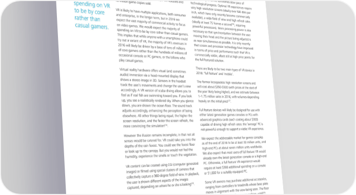 Virtual reality: a billion dollar niche Deloitte Global predicts that virtual reality (VR) will have As with many technologies, the notion of virtual We would its first billion dollar year in 2016, with about $700 million reality is decades old, but its commercial realization expect the in hardware sales, and the remainder from content. has been subject to the sometimes slow pace of majority of We estimate sales of about 2.5 million VR headsets and technological progress. Optimal VR experiences require 10 million game copies sold. very high resolution screens (ideally over 500 dots per spending on VR inch, which have only recently become commercially to be by core VR is likely to have multiple applications, both consumer available), a wide field of view and high refresh rates and enterprise, in the longer term, but in 2016 we 136 (ideally at least 75 frames a second , requiring rather than expect the vast majority of commercial activity to focus powerful processors). More processing power is also casual gamers. on video games. We would expect the majority of necessary so that synchronization between the user spending on VR to be by core rather than casual gamers. moving their head and the picture being adjusted is This implies that while anyone with a smartphone could as near-simultaneous as possible. It is only recently try out a variant of VR, the majority of VR’s revenues in that screen and processor technology have improved 2016 will likely be driven by a base of tens of millions in terms of price and performance such that VR is of core gamers rather than the hundreds of millions of commercially viable, albeit still at high price points for occasional console or PC gamers, or the billions who the full featured solution. play casual games. There are likely to be two main types of VR device in Virtual reality hardware offers visual (and sometimes 2016: ‘full feature’ and ‘mobile’. audio) immersion via a head-mounted display that shows a stereo image in 3D. Sensors in the headset The former incorporates high resolution screens and track the user’s movements and change the user’s view will cost about $350-$500 (with prices at the start of accordingly. A VR version of scuba diving allows you to the year likely being higher), and we estimate between feel as if real fish are swimming toward you. If you look 1–1.75 million sales in 2016, with volumes depending 137 up, you see a realistically rendered sky. When you glance heavily on the initial price . down, you are shown the ocean floor. The sound track adjusts accordingly, enhancing the perception of being Full feature devices will likely be designed for use with elsewhere. All other things being equal, the higher the either latest generation games consoles or PCs with screen resolution, and the faster the screen refresh, the advanced graphics cards (each costing about $300) 134 capable of driving high refresh rates: the ‘average’ PC is more convincing the simulation . not powerful enough to support a viable VR experience. However the illusion remains incomplete, in that not all senses would be catered for. VR could take you into the We expect the addressable market for games consoles depths of the rain forest. You could see the forest floor as of the end of 2016 to be at least 30 million units, and or look up to the canopy. But you would not feel the high-end PCs at about seven million units worldwide. humidity, experience the smells or touch the vegetation. We also expect that most users of full feature VR would already own the latest generation console or a high-end VR content can be created using CGI (computer generated PC. Otherwise, a full feature VR experience would images) or filmed using special clusters of cameras that require at least $300 additional spending on a console collectively capture a 360-degree field of view. In playback, or $1,000 for a suitably equipped PC. the user is shown different aspects of the images 135 Some VR owners may purchase additional accessories, captured, depending on where he or she is looking . ranging from controllers to treadmills whose base plate moves in alignment with the view being seen. The floor 138 would tilt, for example, if you were walking uphill . 22