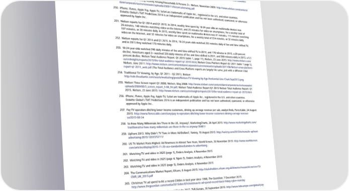 248. In Q1 2013 Americans 18+ watched 311 minutes live and 29 minutes of time-shifted TV, and 310 minutes live and 34 minutes time-shifted in Q1 2014. And Q1 2015 was 295 minutes live and 35 minutes time-shifted. See Nielsen Total Audience Report: Q1 2015 (exhibit 1, page 10), Nielsen, 23 June 2015: http://www.nielsen.com/us/en/insights/reports/2015/the-total-audience- report-q1-2015.html 249. Historical Daily Viewing Activity Among Households & Persons 2+, Nielsen, November 2009: http://www.nielsen.com/content/ dam/corporate/us/en/newswire/uploads/2009/11/historicalviewing.pdf 250. iPhone, iTunes, Apple Pay, Apple TV, Safari are trademarks of Apple Inc., registered in the U.S. and other countries. Deloitte Global’s TMT Predictions 2016 is an independent publication and has not been authorized, sponsored, or otherwise approved by Apple Inc.. 251. Nielsen reports for Q1 2014 and Q1 2015. In 2014, weekly time spent by 18-24 year olds on multimedia devices was 24 minutes, 148 minutes watching video on the Internet, and 25 minutes for video on smartphone, for a weekly total of 197 minutes, or 28 minutes daily. In 2015, weekly time spent on multimedia devices was 81 minutes, 111 minutes watching video on the Internet, and 32 minutes for video on smartphone, for a weekly total of 224 minutes, or 32 minutes daily. 252. Nielsen reports for Q1 2014 and Q1 2015. In 2014, 18-24 years-olds watched 203 minutes daily of live and time shifted TV, and in 2015 they watched 170 minutes daily. 253. 18-24 year-olds watched 240 daily minutes of live and time-shifted TV in 2011, and 170 minutes in 2015, a 29 percent decline. Americans aged 2+ watched 326 daily minutes of live and time-shifted in 2011, and 309 minutes daily in 2015, a 5.3 percent decline. Nielsen Total Audience Report: Q1 2015 (table 1, page 11), Nielsen, 23 June 2015: http://www.nielsen.com/ us/en/insights/reports/2015/the-total-audience-report-q1-2015.html; Nielsen Cross Platform Report Q1 2011 (table 1 page 5), Nielsen, June 2011: http://www.nielsen.com/content/dam/corporate/us/en/newswire/uploads/2011/06/Nielsen-cross-platform- report-q1-2011_web.pdf (The Total Audience and Cross Platform reports are largely the same, just with a different title) 254. Traditional TV Viewing, by Age, Q1 2011 – Q2 2013, Nielsen: http://cdn.theatlantic.com/assets/media/img/posts/Nielsen-TV-Viewing-by-Age-Horizontal-Line-Chart-Sept2013.png 255. Nielsen Three Screen report Q1 2008, Nielsen, May 2008: http://www.nielsen.com/content/dam/corporate/us/en/newswire/ uploads/2009/06/3_screen_report_5-08_fnl.pdf; Nielsen Total Audience Report Q1 2015 Nielsen Total Audience Report: Q1 2015, Nielsen, 23 June 2015: http://www.nielsen.com/us/en/insights/reports/2015/the-total-audience-report-q1-2015.html 256. iPhone, iTunes, Apple Pay, Apple TV, Safari are trademarks of Apple Inc., registered in the U.S. and other countries. Deloitte Global’s TMT Predictions 2016 is an independent publication and has not been authorized, sponsored, or otherwise approved by Apple Inc.. 257. Pay-TV operators ditching lower-income customers, driving up average revenue per sub, analyst finds, FierceCable, 24 August 2015: http://www.fiercecable.com/story/pay-tv-operators-ditching-lower-income-customers-driving-average-revenue- su/2015-08-24 258. So How Many Millennials Are There in the US, Anyway?, MarketingCharts, 28 April 2015: http://www.marketingcharts.com/ traditional/so-how-many-millennials-are-there-in-the-us-anyway-30401/ 259. Upfront 2015: Why Didn’t TV Tune in More Ad Dollars?, Variety, 19 August 2015: http://variety.com/2015/tv/news/tv-upfront- advertising-2015-1201573711/ 260. US TV Market Posts Highest Ad Revenues in Almost Two Years, World Screen, 20 November 2015: http://www.worldscreen. com/articles/display/2015-11-20-usa-standardmediaindex-tv-advertising 261. Watching TV and video in 2025 (page 1), Enders Analysis, 4 November 2015 262. Watching TV and video in 2025 (page 4, figure 5), Enders Analysis, 4 November 2015 263. Watching TV and video in 2025 (page 5), Enders Analysis, 4 November 2015 264. The Communications Market Report, Ofcom, 6 August 2015: http://stakeholders.ofcom.org.uk/binaries/research/cmr/cmr15/ CMR_UK_2015.pdf 265. Christmas TV ad spend to hit a record £300m in best year since 1998, The Guardian, 7 December 2015: http://www.theguardian.com/media/2015/dec/07/christmas-tv-ad-spend-record-black-friday-cyber-monday 266. Global pay-TV market to exceed one billion by 2017, TVB Europe, 30 September 2015: http://www.tvbeurope.com/global-pay- tv-market-exceed-one-billion-2017/ 267. 20 percent of millennials with their own homes who have started families do not subscribe to cable, and the number is 25 percent for childless millennials who have their own homes. For more information, see Millennials and Cutting the Cord, The New York Times, 3 October 2015: http://www.nytimes.com/interactive/2015/10/03/business/media/changing-media- consumption-millenials-cord-cutters.html?_r=0 268. Only 1% of HBO Cable Subscribers Have Cancelled and Switched to HBO Now, Exstreamist, 5 August 2015: http://exstreamist.com/only-1-of-hbo-cable-subscribers-have-cancelled-and-switched-to-hbo-now/ 269. See Sky Sports wins live Premier League rights, Sky, 10 February 2015: https://corporate.sky.com/media-centre/news-page/2015/sky-sports-wins-live-premier-league-rights; and BT Sport wins rights to more live Premier League football matches, BT, 10 February 2015: http://www.btplc.com/News/Articles/ShowArticle. cfm?ArticleID=3396B02E-20AE-42B5-86F8-B834A1E4E0FD 72