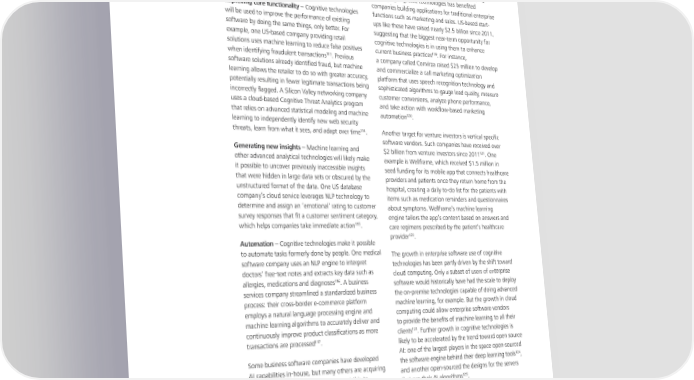 Deloitte Global expects the three main benefits for Venture capital (VC) firms are active in this space too. software companies that have integrated cognitive Since 2011, most VC funding of start-ups developing technologies into their products will be: or applying cognitive technologies has benefited companies building applications for traditional enterprise Improving core functionality – Cognitive technologies functions such as marketing and sales. US-based start- will be used to improve the performance of existing ups like these have raised nearly $2.5 billion since 2011, software by doing the same things, only better. For suggesting that the biggest near-term opportunity for example, one US-based company providing retail cognitive technologies is in using them to enhance solutions uses machine learning to reduce false positives 119 current business practices . For instance, 113 when identifying fraudulent transactions . Previous a company called Convirza raised $25 million to develop software solutions already identified fraud, but machine and commercialize a call marketing optimization learning allows the retailer to do so with greater accuracy, platform that uses speech recognition technology and potentially resulting in fewer legitimate transactions being sophisticated algorithms to gauge lead quality, measure incorrectly flagged. A Silicon Valley networking company customer conversions, analyze phone performance, uses a cloud-based Cognitive Threat Analytics program and take action with workflow-based marketing that relies on advanced statistical modeling and machine 120 automation . learning to independently identify new web security 114 threats, learn from what it sees, and adapt over time . Another target for venture investors is vertical specific software vendors. Such companies have received over Generating new insights – Machine learning and 121 $2 billion from venture investors since 2011 . One other advanced analytical technologies will likely make example is Wellframe, which received $1.5 million in it possible to uncover previously inaccessible insights seed funding for its mobile app that connects healthcare that were hidden in large data sets or obscured by the providers and patients once they return home from the unstructured format of the data. One US database hospital, creating a daily to-do list for the patients with company’s cloud service leverages NLP technology to items such as medication reminders and questionnaires determine and assign an ‘emotional’ rating to customer about symptoms. Wellframe’s machine learning survey responses that fit a customer sentiment category, engine tailors the app’s content based on answers and 115 which helps companies take immediate action . care regimens prescribed by the patient’s healthcare 122 provider . Automation – Cognitive technologies make it possible to automate tasks formerly done by people. One medical The growth in enterprise software use of cognitive software company uses an NLP engine to interpret technologies has been partly driven by the shift toward doctors’ free-text notes and extracts key data such as cloud computing. Only a subset of users of enterprise 116 allergies, medications and diagnoses . A business software would historically have had the scale to deploy services company streamlined a standardized business the on-premise technologies capable of doing advanced process: their cross-border e-commerce platform machine learning, for example. But the growth in cloud employs a natural language processing engine and computing could allow enterprise software vendors machine learning algorithms to accurately deliver and to provide the benefits of machine learning to all their continuously improve product classifications as more 123 clients . Further growth in cognitive technologies is 117 transactions are processed . likely to be accelerated by the trend toward open source AI: one of the largest players in the space open-sourced Some business software companies have developed 124 the software engine behind their deep learning tools , AI capabilities in-house, but many others are acquiring and another open-sourced the designs for the servers capability through M&A, and we expect this to 125 that run their AI algorithms . continue in 2016. Indeed more than 100 mergers and acquisitions involving cognitive technology companies 118 have taken place since 2012 . 18