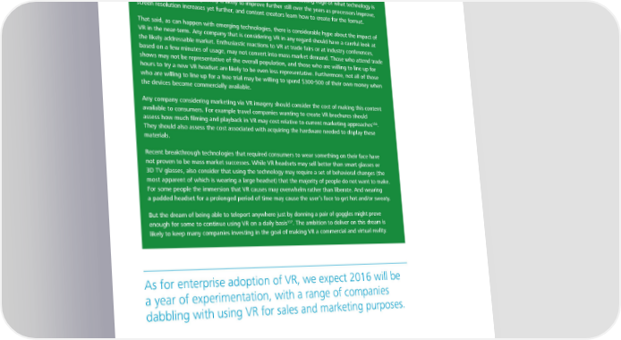 Bottom Line Virtual reality is a fantastic innovation which can demonstrate the cutting edge of what technology is capable of today. VR’s capability is likely to improve further still over the years as processors improve, screen resolution increases yet further, and content creators learn how to create for the format. That said, as can happen with emerging technologies, there is considerable hype about the impact of VR in the near-term. Any company that is considering VR in any regard should have a careful look at the likely addressable market. Enthusiastic reactions to VR at trade fairs or at industry conferences, based on a few minutes of usage, may not convert into mass market demand. Those who attend trade shows may not be representative of the overall population, and those who are willing to line up for hours to try a new VR headset are likely to be even less representative. Furthermore, not all of those who are willing to line up for a free trial may be willing to spend $300-500 of their own money when the devices become commercially available. Any company considering marketing via VR imagery should consider the cost of making this content available to consumers. For example travel companies wanting to create VR brochures should 156. assess how much filming and playback in VR may cost relative to current marketing approaches They should also assess the cost associated with acquiring the hardware needed to display these materials. Recent breakthrough technologies that required consumers to wear something on their face have not proven to be mass market successes. While VR headsets may sell better than smart glasses or 3D TV glasses, also consider that using the technology may require a set of behavioral changes (the most apparent of which is wearing a large headset) that the majority of people do not want to make. For some people the immersion that VR causes may overwhelm rather than liberate. And wearing a padded headset for a prolonged period of time may cause the user’s face to get hot and/or sweaty. But the dream of being able to teleport anywhere just by donning a pair of goggles might prove 157. The ambition to deliver on this dream is enough for some to continue using VR on a daily basis likely to keep many companies investing in the goal of making VR a commercial and virtual reality. As for enterprise adoption of VR, we expect 2016 will be a year of experimentation, with a range of companies dabbling with using VR for sales and marketing purposes. Technology, Media & Telecommunications Predictions 2016 25