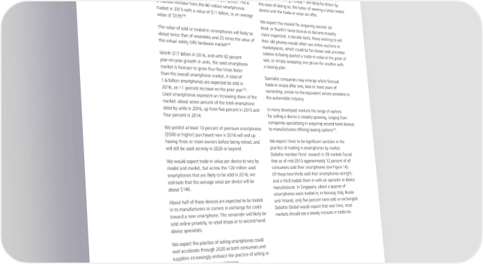 Used smartphones: the $17 billion market you may never have heard of Deloitte Global predicts that in 2016 consumers will For consumers the primary incentives to sell a device – sell outright or trade in approximately 120 million used rather than keeping it as a spare, giving it to a family smartphones generating more than $17 billion for their member or throwing it away – will likely be driven by owners, at an average value of $140 per device. This is the ease of doing so, the luster of owning a latest model a marked increase from the 80 million smartphones device and the trade-in value on offer. traded in 2015 with a value of $11 billion, or an average 328 We expect the market for acquiring second- (or value of $135 . third- or fourth-) hand devices to become steadily The value of sold or traded-in smartphones will likely be more organized. A decade back, those wishing to sell about twice that of wearables and 25 times the value of their old phones would often use online auctions or 329 the virtual reality (VR) hardware market . marketplaces, which could be far slower and uncertain relative to being quoted a trade-in value at the point of Worth $17 billion in 2016, and with 50 percent sale, or simply swapping one phone for another with year-on-year growth in units, the used smartphone a leasing plan. market is forecast to grow four-five times faster than the overall smartphone market. A total of Specialist companies may emerge which forecast 1.6 billion smartphones are expected be sold in trade-in values after one, two or more years of 330 2016, an 11 percent increase on the prior year . ownership, similar to the equivalent service providers in Used smartphones represent an increasing share of the the automobile industry. market: about seven percent of the total smartphone sales by units in 2016, up from five percent in 2015 and In many developed markets the range of options four percent in 2014. for selling a device is steadily growing, ranging from companies specializing in acquiring second-hand devices 331 We predict at least 10 percent of premium smartphones to manufacturers offering leasing options . ($500 or higher) purchased new in 2016 will end up having three or more owners before being retired, and We expect there to be significant variation in the will still be used actively in 2020 or beyond. practice of trading in smartphones by market. Deloitte member firms’ research in 20 markets found We would expect trade-in value per device to vary by that as of mid-2015 approximately 12 percent of all model and market, but across the 120 million used consumers sold their smartphones (see Figure 16). smartphones that are likely to be sold in 2016, we Of these two-thirds sold their smartphones outright, estimate that the average value per device will be and a third traded them in with an operator or device about $140. manufacturer. In Singapore, about a quarter of smartphones were traded in; in Norway, Italy, Russia About half of these devices are expected to be traded and Finland, only five percent were sold or exchanged. in to manufacturers or carriers in exchange for credit Deloitte Global would expect that over time, most toward a new smartphone. The remainder will likely be markets should see a steady increase in trade-ins. sold online privately, to retail shops or to second-hand device specialists. We expect the practice of selling smartphones could well accelerate through 2020 as both consumers and suppliers increasingly embrace the practice of selling or acquiring second-hand smartphones. 50