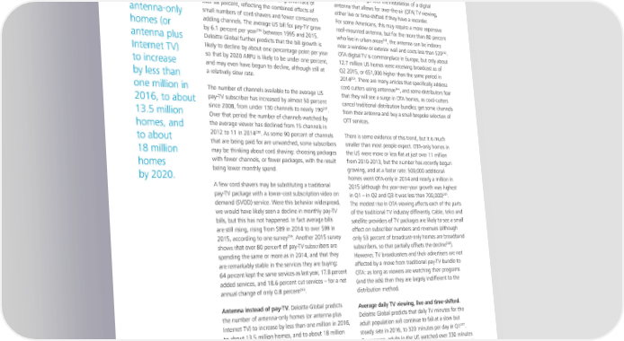 Average monthly pay-TV bill. Deloitte Global predicts Many North Americans are unaware that many of the Deloitte Global that the monthly TV bill in 2016 will be about five channels they would like to watch are available for predicts the percent higher than the average $100 per month bill no monthly charge with the installation of a digital number of in 2015, or lower than the historical growth rate of antenna that allows for over-the-air (OTA) TV viewing, over six percent, reflecting the combined effects of either live or time-shifted if they have a recorder. antenna-only small numbers of cord shavers and fewer consumers For some Americans, this may require a more expensive homes (or adding channels. The average US bill for pay-TV grew roof-mounted antenna, but for the more than 80 percent 236 241 by 6.1 percent per year between 1995 and 2015. who live in urban areas , the antenna can be indoors 242 antenna plus Deloitte Global further predicts that the bill growth is near a window or exterior wall and costs less than $20 . Internet TV) likely to decline by about one percentage point per year OTA digital TV is commonplace in Europe, but only about so that by 2020 ARPU is likely to be under one percent, 12.7 million US homes were receiving broadcast as of to increase and may even have begun to decline, although still at Q2 2015, or 651,000 higher than the same period in 243 by less than a relatively slow rate. 2014 . There are many articles that specifically address 244 cord cutters using antennas , and some distributors fear one million in The number of channels available to the average US that they will see a surge in OTA homes, as cord-cutters 2016, to about pay-TV subscriber has increased by almost 50 percent cancel traditional distribution bundles; get some channels 237 13.5 million since 2008, from under 130 channels to nearly 190 . from their antenna and buy a small bespoke selection of Over that period the number of channels watched by OTT services. homes, and the average viewer has declined from 15 channels in 238 to about 2012 to 11 in 2014 . As some 90 percent of channels There is some evidence of this trend, but it is much that are being paid for are unwatched, some subscribers smaller than most people expect. OTA-only homes in 18 million may be thinking about cord shaving: choosing packages the US were more or less flat at just over 11 million homes with fewer channels, or fewer packages, with the result from 2010-2013, but the number has recently begun by 2020. being lower monthly spend. growing, and at a faster rate: 500,000 additional homes went OTA-only in 2014 and nearly a million in A few cord shavers may be substituting a traditional 2015 (although the year-over-year growth was highest pay-TV package with a lower-cost subscription video on 245 in Q1 – in Q2 and Q3 it was less than 700,000) . demand (SVOD) service. Were this behavior widespread, The modest rise in OTA viewing affects each of the parts we would have likely seen a decline in monthly pay-TV of the traditional TV industry differently. Cable, telco and bills, but this has not happened. In fact average bills satellite providers of TV packages are likely to see a small are still rising, rising from $89 in 2014 to over $99 in effect on subscriber numbers and revenues (although 239 2015, according to one survey . Another 2015 survey only 53 percent of broadcast-only homes are broadband shows that over 80 percent of pay-TV subscribers are 246 subscribers, so that partially offsets the decline ). spending the same or more as in 2014, and that they However, TV broadcasters and their advertisers are not are remarkably stable in the services they are buying: affected by a move from traditional pay-TV bundle to 64 percent kept the same services as last year, 17.8 percent OTA: as long as viewers are watching their programs added services, and 18.6 percent cut services – for a net (and the ads) then they are largely indifferent to the 240 annual change of only 0.8 percent . distribution method. Antenna instead of pay-TV. Deloitte Global predicts Average daily TV viewing, live and time-shifted. the number of antenna-only homes (or antenna plus Deloitte Global predicts that daily TV minutes for the Internet TV) to increase by less than one million in 2016, adult population will continue to fall at a slow but to about 13.5 million homes, and to about 18 million 247 steady rate in 2016, to 320 minutes per day in Q1 . homes by 2020. On average, adults in the US watched over 330 minutes of traditional live and time-shifted TV per day in Q1 2015 on a TV set. This is 14 minutes down from 2014, and 248 10 minutes lower than in 2013 . 36