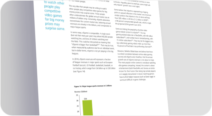 eSports: bigger and smaller than you think 281 Deloitte Global predicts that eSports will generate Revenues for eSports are predicted to grow 25 percent The very idea global revenues of $500 million in 2016, up 25 percent in 2016, which is better than most mature sports, 282 that people from about $400 million in 2015 , and will likely have many of which have been around for a century or even may be willing an audience of regular and occasional viewers of close centuries. Arguably, given its small size, some might ask to 150 million people. why eSports’ growth rate is not higher. to watch other The very idea that people may be willing to watch Some believe that eSports is approaching a tipping people play other people play competitive video games for big point or upward inflection in the market: one American competitive money prizes may surprise some. These people analyst predicts that eSports in the US alone will leap 284 video games often underestimate the global annual market size at from $85 million in 2014 to $1.2 billion in 2018 : millions of dollars only. Conversely, eSports advocates a 94 percent compounded growth rate, which is triple for big money overestimate the current market size, believing annual the projected 2016 growth over 2015. prizes may revenues are already in the billions, and comparable to major league sports. Some are linking the popularity of online video 285 surprise some. game-related content to eSports . The top In some ways, eSports is comparable. A single event gaming-related video star is PewDiePie, with 40 million 286 (but not that many per year) may attract 40,000 people subscribers , and number two is VanossGaming, with 287 watching live, and tens of millions watching over 15 million subscribers . They may be the biggest stars, the Web. This could be interpreted as meaning that but collectively gaming videos make up more than 283 288 “eSports is bigger than basketball ”. That may be true, 10 percent of YouTube’s top performing channels . when measured by audience size for an individual event, but in dollar terms, eSports is not yet playing in the big However, Deloitte Global does not believe that there leagues. is a direct correlation between online video gaming success and eSports and, therefore, that the annual In 2016, eSports revenues will represent a fraction growth rate of eSports revenues is not about to triple. of league revenues in major sports such as European The most popular online content is not about watching football (soccer), US football, basketball, baseball, or elite gamers competing. Instead, the content is about ice hockey which range from $4 billion up to $30 billion entertainment (both PewDiePie and Vanoss are better (see Figure 14). known for their humor than being top-ranked players) or is largely instructional in nature: teaching gamers how to find hidden treasures (such as Easter eggs) or surmount difficult in-game challenges. Figure 14: Major league sports revenues in $ billions Revenue ($billion) 35 30 $30 25 20 15 $11 10 $8 5 $5 $4 $0.5 0 European football NFL football MLB baseball NBA basketball NHL hockey eSports 2016 2015 2014 2014 2015 2016 Note: Revenue figures include ticket sales, TV rights, sponsorships and other commercial sources Source: Forbes and Deloitte Global analysis based on publicly available sources. For further information on the sources, see endnotes. 42