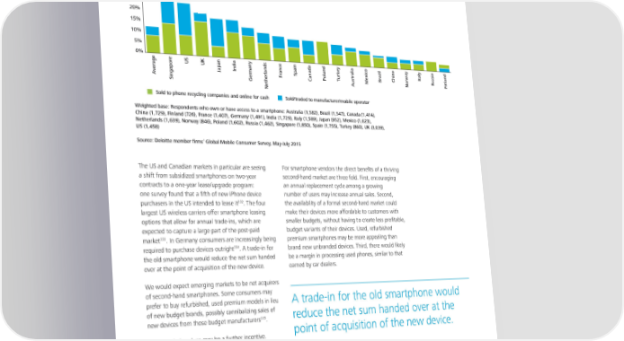 Figure 16: Respondents who sell or trade in their previous smartphone Question: What did you do with your previous smartphone when you last upgraded? 30% 25% 20% 15% 10% 5% 0% y a d a y a US UK India Ital Japan France Spain Canad Polan Turkey Mexico Brazil Chin Norway Russi Finland AverageSingapore German Australia Netherlands Sold to phone recycling companies and online for cash Sold/traded to manufacturer/mobile operator Weighted base: Respondents who own or have access to a smartphone: Australia (1,582), Brazil (1,547), Canada (1,414), China (1,729), Finland (726), France (1,407), Germany (1,491), India (1,729), Italy (1,589), Japan (952), Mexico (1,623), Netherlands (1,639), Norway (846), Poland (1,602), Russia (1,462), Singapore (1,850), Spain (1,755), Turkey (860), UK (3,039), US (1,458) Source: Deloitte member firms’ Global Mobile Consumer Survey, May-July 2015 The US and Canadian markets in particular are seeing For smartphone vendors the direct benefits of a thriving a shift from subsidized smartphones on two-year second-hand market are three fold. First, encouraging contracts to a one-year lease/upgrade program: an annual replacement cycle among a growing one survey found that a fifth of new iPhone device number of users may increase annual sales. Second, 332 purchasers in the US intended to lease it . The four the availability of a formal second-hand market could largest US wireless carriers offer smartphone leasing make their devices more affordable to customers with options that allow for annual trade-ins, which are smaller budgets, without having to create less profitable, expected to capture a large part of the post-paid budget variants of their devices. Used, refurbished 333 market . In Germany consumers are increasingly being premium smartphones may be more appealing than 334 required to purchase devices outright . A trade-in for brand new unbranded devices. Third, there would likely the old smartphone would reduce the net sum handed be a margin in processing used phones, similar to that over at the point of acquisition of the new device. earned by car dealers. We would expect emerging markets to be net acquirers of second-hand smartphones. Some consumers may prefer to buy refurbished, used premium models in lieu A trade-in for the old smartphone would of new budget brands, possibly cannibalizing sales of 335 reduce the net sum handed over at the new devices from those budget manufacturers . Rising trade-in values may be a further incentive. point of acquisition of the new device. In the UK market, the average price of a used handset 336 increased from $30 in 2007 to $165 in 2013 . Some models may retain 70 percent of their value nine 337 months post launch . Technology, Media & Telecommunications Predictions 2016 51