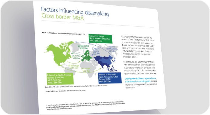 Factors influencing dealmaking Cross border M&A Figure 11. Cross-border deal values by target region ($bn), 2015 YTD ’ bo to ro…e Cross-border M&A has been one of the key Nort€ America: ˆ150.Šb features of 2015 – so far this year $1.07 trillion APAC: ˆ6Œ.1b in cross-border deals have been announced. Europe has been at the centre of cross-border ro…e to †‡ ‘a…a to deals, with European companies participating ˆ20‰.Šb C€i a to Nort€ America in 53% of all announced deals. The North ro…e ˆ26.Žb ˆ‹5.5b America-Europe corridor has dominated, †‡ to † worth $311 billion. ˆ‹‹.Œb So far this year, the growth markets nations † to ro…e have announced $49.6 billion of acquisitions ˆ11Ž.1b † to APAC in G7 nations, whereas the G7 nations have ˆ22.5b announced only $30.7 billion in M&A deals in ’ bo to Nort€ America ’ bo to Asia-Pacific growth markets, the lowest in over a decade. ro…e: ˆ160.5b Nort€ America: ˆ‹1.Žb MA: ˆŽŒ.‰b ro…e: ˆŠ.1b Cross-border deal flow is expected to be APAC: ˆ56.Šb MA: ˆ10.5b a key theme in the coming years, as major Note: 2015 YTD refers to 16 November 2015. APAC refers to Asia-Pacific; MA refers to AfricaMie ast economies strike agreements and alliances to orce: Deoitte a asis base o ata from T€omso ‚ e ƒa „er bolster trade. 2. The G7 comprises of Canada, France ,Italy, Germany, Japan, UK and US. The growth markets are defined as Brazil, China (incl. Hong Kong), Czech Republic, Egypt, Hungary, India, Indonesia, Malaysia, Mexico, Morocco, Peru, Philippines, Poland, Russia, South Africa, Taiwan, Thailand, Turkey, Saudi Arabia, United Arab Emirates.