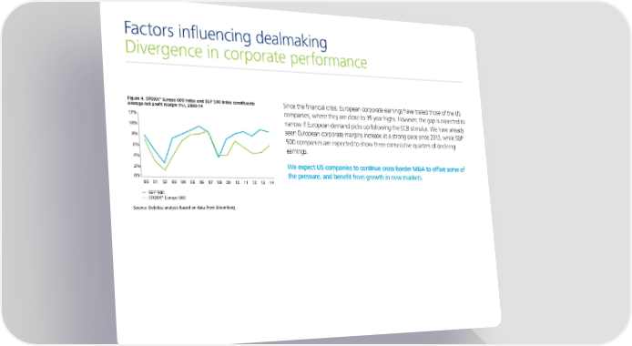 Factors influencing dealmaking Divergence in corporate performance ® Figure 4. STOXX Europe 600 Index and S&P 500 Index constituents Since the financial crisis, European corporate earnings have trailed those of the US average net profit argin 000€4 companies, where they are close to 15 year highs. However, the gap is expected to narrow if European demand picks up following the ECB stimulus. We have already 0 seen European corporate margins increase at a strong pace since 2013, while S&P 500 companies are expected to show three consecutive quarters of declining 6 earnings. We expect US companies to continue cross-border M&A to offset some of 0 the pressure, and benefit from growth in new markets. 00 0 0 0 0 05 06 0‚ 0 0€ 0 S&P 500 STOXX® Europe 600 Source: Deloitte analysis based on data from loomber