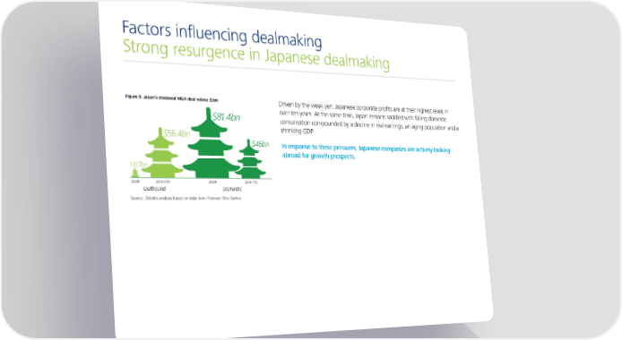 Factors influencing dealmaking Strong resurgence in Japanese dealmaking Figure 9. Japan’s disclosed M&A deal values ($bn) Driven by the weak yen, Japanese corporate profits are at their highest levels in $81.4bn over ten years. At the same time, Japan remains saddled with falling domestic consumption compounded by a decline in real earnings, an aging population and a $56.4bn shrinking GDP. $46bn In response to these pressures, Japanese companies are actively looking abroad for growth prospects. $10.7bn 2009 2015 YTD 2009 2015 YTD Outbound Domestic Source: Deloitte analysis based on data from Thomson One Banker