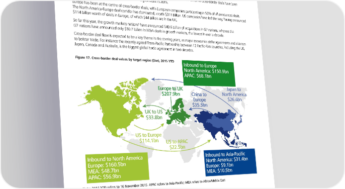 12 | The Deloitte M&A Index Q4 2015 2016: Opportunities amidst divergence Deal corridors The US and UK lead cross-border M&A Cross-border M&A has been one of the key features of 2015. So far this year $1.07 trillion in cross-border deals have been announced and this includes three of the ten largest deals in 2015. Europe has been at the centre of cross-border deals, with European companies participating in 53% of all announced deals. The North America-Europe deal corridor has dominated, worth $311 billion. US companies have led the way, having announced $114 billion worth of deals in Europe, of which $44 billion are in the UK. 4 So far this year, the growth markets nations have announced $49.6 billion of acquisitions in G7 nations, whereas the G7 nations have announced only $30.7 billion in M&A deals in growth markets, the lowest in over a decade. Cross-border deal flow is expected to be a key theme in the coming years, as major economies strike agreements and alliances to bolster trade. For instance the recently agreed Trans-Pacific Partnership between 12 Pacific-Rim countries, including the US, Japan, Canada and Australia, is the biggest global trade agreement in two decades. Figure 17. Cross-border deal values by target region ($bn), 2015 YT ’ bo to ro…e Nort€ America: ˆ150.Šb APAC: ˆ6Œ.1b ro…e to †‡ ‘a…a to ˆ20‰.Šb C€i a to Nort€ America ro…e ˆ26.Žb ˆ‹5.5b †‡ to † ˆ‹‹.Œb † to ro…e ˆ11Ž.1b † to APAC ˆ22.5b ’ bo to Nort€ America ’ bo to Asia-Pacific ro…e: ˆ160.5b Nort€ America: ˆ‹1.Žb MA: ˆŽŒ.‰b ro…e: ˆŠ.1b APAC: ˆ56.Šb MA: ˆ10.5b Note: 2015 YTD refers to 16 November 2015. APAC refers to Asia-Pacific; MA refers to AfricaMie ast orce: Deoitte a asis base o ata from T€omso ‚ e ƒa „er Figure 18. Cross border M&A deal values by target sector ($bn), 201 201 M 11 173 148 101 158 166 113 120 2014 Q3 283 179 155 141 114 41 113 179 2015 LTM onsumer Energy & inancial ife anufacturing Real Telecoms Business Resources Services Sciences Estate edia & ealthcare Professional & Technology Services Source: Deloitte analysis based on data from Thomson One Banker 4. Please refer to Charts we like (page 22-23) for definition of growth markets