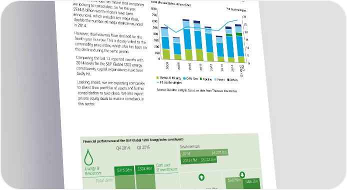 The Deloitte M&A Index Q4 2015 2016: Opportunities amidst divergence | 17 Sectors Energy and resources Figure 26. Global disclosed deal values for Energy & Resources subsectors as The end of the commodity super-cycle has a target ($bn), 200 20 € reverberated dramatically across M&A markets. Total disclosed deal values ($bn) P/E deal multiples Pressure on revenues has meant that companies ˆ ƒ are looking to consolidate. So far this year $534.8 billion worth of deals have been ‡ ‚… announced, which includes ten mega deals, † double the number of mega deals announced … ‚ in 2014. „ €… However, deal volumes have declined for the ƒ fourth year in a row. This is closely linked to the € commodity price index, which also has been on ‚ the decline during the same period. € … Comparing the last 12 reported months with 2014 levels for the S&P Global 1200 energy ‚ˆ ‚‹ ‚€ ‚€€ ‚€‚ ‚€ƒ ‚€„ ŠT constituents, capital expenditures have been ‰ƒ ‚€… badly hit. etals inin Oil as Pipeline Po er Others Looking ahead, we are expecting companies PE deal multiples to divest their portfolio of assets and further Source: Deloitte analysis based on data from Thomson One aner consolidation to take place. We also expect private equity deals to make a comeback in this sector. Financial performance of the S&P Global 1200 Energy Index constituents Q4 2014 Q2 2015 Total revenues $ €bn Energy & Cash and ƒTM $3 bn Resources $3bn $3 bn ST investments Total debt $3bn $„ bn $33„bn $3„‚bn $3 bn $€‚bn Cash spent Capital on M&A expenditure $bn $€bn $3‚bn $ € bn Note: LTM refers to the last tele months from the latest reported date Common Share Source: Deloitte analysis based on data from S&P Capital IQ dividends paid repurchases