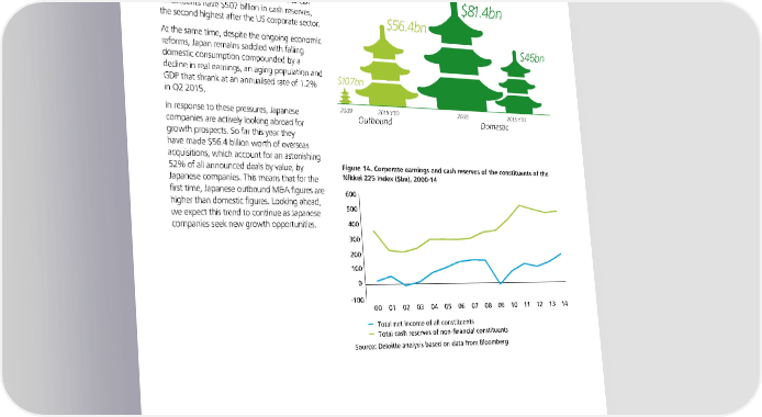 The Deloitte M&A Index Q4 2015 2016: Opportunities amidst divergence | 9 Factors influencing M&A in 2016 Strong resurgence in Japanese dealmaking Figure 13. Japan’s disclosed M&A deal values ($bn) Driven by the weak yen, Japanese corporate profits are at their highest levels in over ten years. $81.4bn We estimate that the Nikkei 225 non-financial constituents have $507 billion in cash reserves, $56.4bn the second highest after the US corporate sector. At the same time, despite the ongoing economic $46bn reforms, Japan remains saddled with falling domestic consumption compounded by a decline in real earnings, an aging population and $10.7bn GDP that shrank at an annualised rate of 1.2% in Q2 2015. In response to these pressures, Japanese 2009 2015 YTD 2009 2015 YTD companies are actively looking abroad for Outbound Domestic growth prospects. So far this year they have made $56.4 billion worth of overseas acquisitions, which account for an astonishing 52% of all announced deals by value, by Figure 14. Corporate earnings and cash reserves of the constituents of the Japanese companies. This means that for the Nikkei 225 Index ($bn 214 first time, Japanese outbound M&A figures are 00 higher than domestic figures. Looking ahead, 00 we expect this trend to continue as Japanese companies seek new growth opportunities. 00 300 200 100 0 -100 00 01 02 03 0 0 0 0 0 0 10 11 12 13 1 Total net income of all constituents Total cash reserves of non-financial constituents Source: Deloitte analysis based on data from Bloomberg