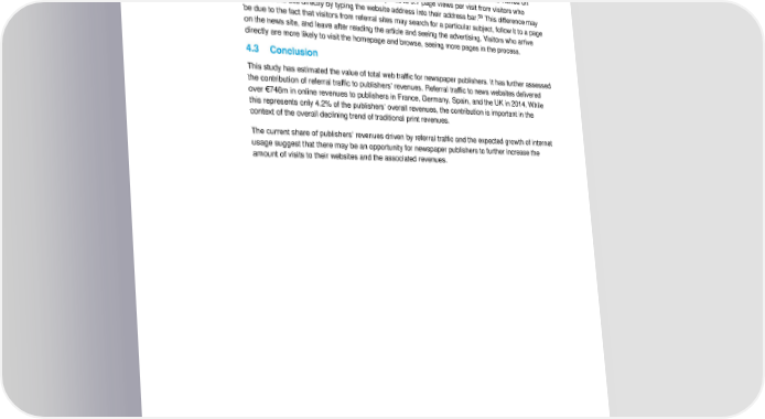 The impact of web traffic on revenues of traditional newspaper publishers 4.2.1 Estimating the value of a single visit Based on the data and results of the analysis, the study compared the value of visits by users who access the news sites directly and who access them via referral websites. The analysis found that on average, there is no difference in the revenue that individual visits (a single page view) from different sources generate. In other words, a page view by a visitor referred from another websiteis just as valuable as a page view from a visitor who comes in directly. The average value of a visit ranges from 57 €0.04 to €0.08. Analysis of the comScore data shows that the visitors who accessed from referral sites viewed on average 4.3 pages during their visit. This compares to 5.7 page views per visit from visitors who 58 accessed the site directly by typing the website address into their address bar. This difference may be due to the fact that visitors from referral sites may search for a particular subject, follow it to a page on the news site, and leave after reading the article and seeing the advertising. Visitors who arrive directly are more likely to visit the homepage and browse, seeing more pages in the process. 4.3 Conclusion This study has estimated the value of total web traffic for newspaper publishers. It has further assessed the contribution of referral traffic to publishers’ revenues. Referral traffic to news websites delivered over €746m in online revenues to publishers in France, Germany, Spain, and the UK in 2014. While this represents only 4.2% of the publishers’ overall revenues, the contribution is important in the context of the overall declining trend of traditional print revenues. The current share of publishers’ revenues driven by referral traffic and the expected growth of internet usage suggest that there may be an opportunity for newspaper publishers to further increase the amount of visits to their websites and the associated revenues. 57 Deloitte analysis, methodology provided in the appendix. Deloitte LLP. 17