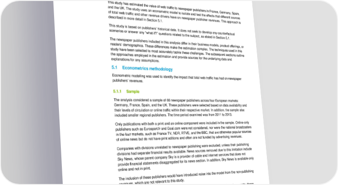 The impact of web traffic on revenues of traditional newspaper publishers 5 Appendix: Methodology This study has estimated the value of web traffic to newspaper publishers in France, Germany, Spain, and the UK. The study uses an econometric model to isolate and test the effects that different sources of total web traffic and other revenue drivers have on newspaper publisher revenues. This approach is described in more detail in Section 5.1. This study is based on publishers’ historical data. It does not seek to develop any counterfactual scenarios or answer any “what if?” questions related to the subject, as stated in Section 5.1. The newspaper publishers included in this analysis differ in their business models, product offerings, or readers’ demographics. These differences make the estimation complex. The techniques used in this study have been selected to most accurately tackle these challenges. The subsequent sections outline the approaches employed in the estimation and provide sources for the underlying data and explanations for any assumptions. 5.1 Econometrics methodology Econometric modelling was used to identify the impact that total web traffic has had on newspaper publishers’ revenues. 5.1.1 Sample The analysis considered a sample of 66 newspaper publishers across four European markets: Germany, France, Spain, and the UK. These publishers were selected based on data availability and their levels of circulation or online traffic within their respective market. In addition, the sample also included smaller regional publishers. The time period examined was from 2011 to 2013. Only publications with both a print and an online component were included in the sample. Online-only publishers such as Eurosport.fr and Goal.com were not considered, nor were the national broadcasters in the four markets, such as France TV, NDR, RTVE, and the BBC, that are otherwise popular sources of online news but do not have print editions and often are not funded by advertising revenues. Companies with divisions unrelated to newspaper publishing were excluded, unless their publishing divisions had separate financial results available. News sources removed due to this limitation include Sky News, whose parent company Sky is a provider of cable and internet services that does not provide financial statements disaggregated for its news section. In addition, Sky News is available only online and not in print. The inclusion of these publishers would have introduced noise into the model from the non-publishing revenues, which are not relevant to this study. In addition to these exclusions, where data for some publishers was unavailable or inaccurate, these publishers were not included. The size of the sample varied across years due to missing values for some publishers. Different sample sizes did not affect the reliability of the estimation under the fixed effects methodology, which is described below. Deloitte LLP. 18