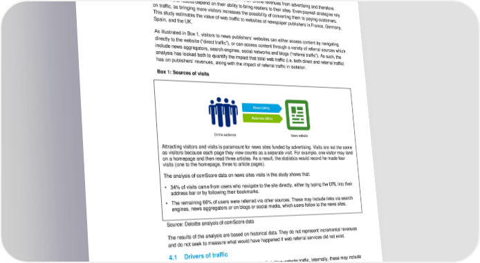 The impact of web traffic on revenues of traditional newspaper publishers 4 The impact of web traffic on newspaper publishers Newspaper publishers still derive a majority of their online revenues from advertising and therefore their financial results depend on their ability to bring readers to their sites. Even paywall strategies rely on traffic, as bringing more visitors increases the possibility of converting them to paying customers. This study estimates the value of web traffic to websites of newspaper publishers in France, Germany, Spain, and the UK. As illustrated in Box 1, visitors to news publishers’ websites can either access content by navigating directly to the website (“direct traffic”), or can access content through a variety of referral sources which include news aggregators, search engines, social networks and blogs (“referral traffic”). As such, the analysis has looked both to quantify the impact that total web traffic (i.e. both direct and referral traffic) has on publishers’ revenues, along with the impact of referral traffic in isolation. Box 1: Sources of visits Direct (34%) Referrals (66%) Online audience News website Attracting visitors and visits is paramount for news sites funded by advertising. Visits are not the same as visitors because each page they view counts as a separate visit. For example, one visitor may land on a homepage and then read three articles. As a result, the statistics would record he made four visits (one to the homepage, three to article pages). The analysis of comScore data on news sites visits in this study shows that: 34% of visits came from users who navigate to the site directly, either by typing the URL into their address bar or by following their bookmarks. The remaining 66% of users were referred via other sources. These may include links via search engines, news aggregators or on blogs or social media, which users follow to the news sites. Source: Deloitte analysis of comScore data The results of the analysis are based on historical data. They do not represent incremental revenues and do not seek to measure what would have happened if web referral services did not exist. 4.1 Drivers of traffic There are multiple internal and external factors that drive website traffic. Internally, these may include the quality of content and presentation; externally it may be a brand value, an effective online promotion strategy, or discoverability of content. While a significant portion of publishers’ overall revenues derive from their print operations (see Section 2), online revenues enabled by website traffic are growing in size and importance. The website traffic can come from different sources: visitors can access a page directly, or via other sites such as search engines, news aggregators or through social media. On news sites funded by advertising, visitors are exposed to ads whenever they load a page, which directly translates to revenues for the publisher. Deloitte LLP. 14