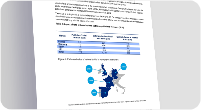 The impact of web traffic on revenues of traditional newspaper publishers Disaggregated data for online and offline segments were not available on a consistent basis across countries. The availability of separated online revenues would have allowed for the assessment of the impact of total web traffic on that segment only; however, the aggregated data do not impact the robustness of the results. In addition, considering the total revenues allows the analysis to examine possible cross-segment effects of website traffic or circulation. The results show a positive relationship between website visits and revenue generated by publishers, with a 10% increase in total website traffic increasing publishers’ revenues by an estimated 0.64%. The share of referral traffic to newspaper publishers’ websites has been around 66% across the four countries for this period. This suggests that a 10% increase in referral traffic alone is associated with an estimated 0.42% increase in publishers’ overall revenues. Based on these results, and assuming the effects hold for all publishers in a market, the value of referral traffic to news sites across the four markets in 2014 would be €746m. Country-level impacts are proportional to the size of the market: publishers in Germany, the biggest market in the study, experienced the highest impact worth €326m, followed by the UK (€208m), and France (€148m). Spanish publishers generated an estimated €264m through referrals in 2014. The value of a single visit is estimated to range from €0.04 to €0.08. On average, the visitors who access a news site directly view more pages than those who arrive from other referral sources, although the value of each page view does not vary with the source of access. Table 1: Impact of total web and referral traffic on publishers’ revenues (2014) Market Publishers’ total Estimated value of total Estimated value of referral revenue (€bn) web traffic (€m) traffic (€m) France 3.5 224 148 Germany 7.7 494 326 Spain 1.5 96 64 UK 4.9 314 208 Total 17.6 1,128 746 Figure 1: Estimated value of referral traffic to newspaper publishers $326m $208m $148m $64m Source: Deloitte analysis based on sources and methodologies described in the report. Figures may not sum due to rounding Conclusion In summary, this study has estimated the value of total web traffic for newspaper publishers and focussed on the contribution of referral traffic to publishers’ revenues. Referral traffic to news websites delivered an estimated €746m in online revenues to publishers in France, Germany, Spain, and the UK in 2014. This represents 4.2% of the publishers’ overall revenues and there exist wider impacts of the Internet on newspaper publishers, the contribution is important in the context of the overall declining trend of traditional print revenues. The current share of publishers’ revenues driven by referral traffic and the expected growth of internet usage suggest that there may be an opportunity for newspaper publishers to further increase visits to their websites and the associated revenues. Deloitte LLP. 4