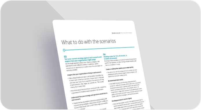 An event or an era? | What to do with the scenarios What to do with the scenarios 03 04 Test your current strategy against each scenario and Develop a plan for 12 to 18 months, in explore how your organization might adapt 6 month increments Ask the tough questions about your mission, strategies, and Planning in these conditions is not about having a full operational operations in each different scenario. In addition, use the plan for each scenario, but about having sufficient flexibility and scenarios as an opportunity to explore topics that you might not choices as conditions change. normally consider. Create a roadmap that enables you to adapt quickly Imagine that your organization is living in each scenario • Set a direction, identify strategic elements at high risk under • Take a deep breath and really try to feel what it would be like changing scenarios, prioritize opportunities to explore, and to live in each of the four scenarios. Do your best to meditate determine criteria for shifting course. and clear your head. Try to experience the emotions of living in each scenario—fear, anger, joy, surprise, etc. This sounds Be intentional about equity cheesy, but it really helps. • The COVID-19 crisis is contributing to disparate health, • Also think about how one of your constituents (for nonprofits) economic, and racial outcomes. At the same time, a movement or grantees (for funders) would experience the scenario. for greater racial justice is gaining traction and social sector leaders are being called upon—and calling for others—to Understand how your strategy and operations would fare in respond and change their practices. As you develop your plans, each scenario apply a clear equity lens both to your external work and to your • Unpack the key assumptions about your programming and/ values, statements, strategies, and internal processes. or grantmaking strategies. What would still work in different Develop processes to monitor signals futures? What would need to shift? What might you need to abandon entirely? • Once you have a plan, consider what signals you can track to • Evaluate your operations in each scenario. What would understand which scenario we’re moving toward and how you each scenario mean for your fundraising? Staffing? Digital might make adjustments to your plans as new information infrastructure? appears. The processes don’t need to be fancy. It could be as simple as keeping a bulletin board where people can post Explore less incremental actions relevant articles for future discussion and then periodically assessing the implications of the signals you’ve collected— Don’t ignore more significant changes that you might make in especially signs that suggest we may be heading towards one some of the scenarios. For example: scenario or another. • Under what conditions would you reframe your mission or stake out a bold moonshot initiative? • When would you consider taking a strong, values-driven, ideological stance? What would that look like for your organization? • What new or unlikely partnerships might you consider? • For funders, what would it take for you to double or triple your payout rate, or even consider spending down? For nonprofits, consider what emergency financing you could access, or even how you might explore mergers or dissolution in the worst case. 21