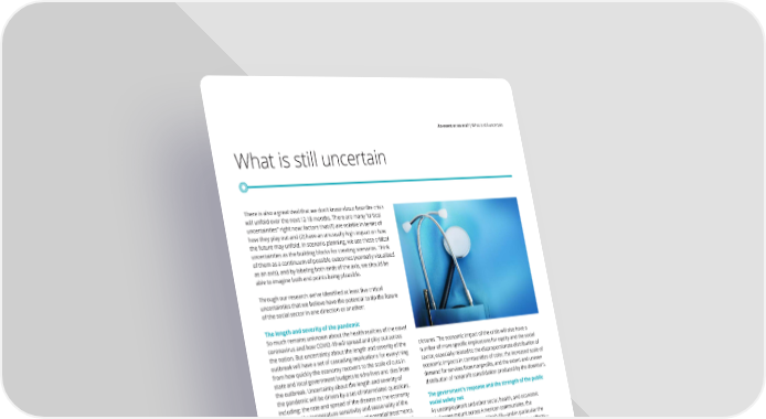 An event or an era? | What is still uncertain What is still uncertain There is also a great deal that we don’t know about how the crisis will unfold over the next 12-18 months. There are many “critical uncertainties” right now: factors that (1) are volatile in terms of how they play out and (2) have an unusually high impact on how the future may unfold. In scenario planning, we use these critical uncertainties as the building blocks for creating scenarios. Think of them as a continuum of possible outcomes (normally visualized as an axis), and by labeling both ends of the axis, we should be able to imagine both end points being plausible. Through our research we’ve identified at least five critical uncertainties that we believe have the potential to tip the future of the social sector in one direction or another: The length and severity of the pandemic So much remains unknown about the health realities of the novel coronavirus and how COVID-19 will spread and play out across the nation. But uncertainty about the length and severity of the closures. The economic impact of the crisis will also have a outbreak will have a set of cascading implications for everything number of more specific implications for equity and the social from how quickly the economy recovers to the scale of cuts in sector, especially related to the disproportionate distribution of state and local government budgets to who lives and dies from economic impacts in communities of color, the increased scale of the outbreak. Uncertainty about the length and severity of demand for services from nonprofits, and the extent and uneven the pandemic will be driven by a set of interrelated questions, distribution of nonprofit consolidation produced by the downturn. including: the rate and spread of the disease as the economy The government’s response and the strength of the public reopens; the temperature sensitivity and seasonality of the social safety net disease; the timing and effectiveness of potential treatments, As unemployment and other social, health, and economic management protocols, and/or vaccines; and the duration of challenges mount across American communities, the antibodies and/or immunity. In addition, the distribution of health government’s response to COVID-19—and in particular the impacts—and the accessibility of testing and treatments—in strength of the public social safety net and stimulus efforts— marginalized communities are likely to have outsized implications will have massive implications for the social sector and the related to the social sector and racial equity concerns. recovery of individuals, businesses, and organizations that will The length and severity of the economic downturn vary widely from place to place. In many parts of the country, Economic activity in the United States has fallen in the wake it remains unclear whether government safety net programs of the COVID-19 pandemic. Unemployment has risen sharply, will be sufficient to keep individuals from falling through the and there is some fear that the economic decline may rival cracks. And uneven access to stimulus funds will have enormous 11 implications across communities. Uncertainties around the the Great Depression. The economic damage of the virus will likely go beyond temporary decreases in spending and job losses; government response to the crisis will be driven by several key consumer behavior appears to be changing as well, and regardless questions, including: how significantly state and local budgets are of any resurgence of the virus there will likely not be a quick return affected by the crisis; the level of coordination of recovery and to normal as social distancing measures, ongoing anxiety about stimulus efforts across the federal, state, and local levels; and the the virus, and precautionary consumer saving may blunt a hoped- outcomes of the 2020 elections, including state and local races. for burst of pent-up demand. The length and severity of the Other governmental uncertainties, such as possible regulation economic downturn will depend on several key factors, including: and stimulus efforts for funders and nonprofits, the potential the shape of the economic “recovery curve;” the willingness of for decreased civic engagement, and potential disruption of key consumers to spend and businesses to make capital expenditures; government processes like the election and the census will also the degree to which the economy is staked to the trajectory of the have important consequences for the social sector. pandemic; the scale, duration, and distribution of job losses; and the scale of bankruptcies and organizational 07