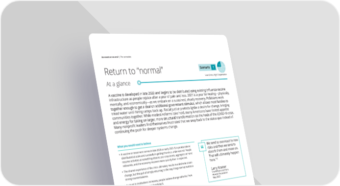 An event or an era? | The scenarios Scenario 1 1 4 Return to “normal” 2 3 Low Crisis, High Cooperation At a glance A vaccine is developed in late 2020 and begins to be distributed using existing influenza vaccine infrastructure as people rejoice after a year of pain and loss. 2021 is a year for healing—physically, mentally, and economically—as we embark on a sustained, steady recovery. Politicians work together enough to get a deal on additional government stimulus, which allows most families to tread water until hiring ramps back up. Racial justice protests ignite a desire for change, bringing communities together. While modest reforms take hold, many Americans have limited appetite and energy for taking on larger, more structural transformation on the heels of the COVID-19 crisis. Many nonprofit leaders find themselves frustrated that we snap back to the status quo instead of continuing the push for deeper systems change. What you would need to believe • A vaccine or treatment comes in late 2020 or early 2021. It is produced and We tend to overreact to new distributed at scale and succeeds in getting the virus under control. People risks and then we tend to resume activities at something close to pre-crisis levels, aggregate demand “ absorb them and move on. rebounds, and the economy recovers more quickly than is expected. That will ultimately happen • The shared experience of the crisis ultimately results in a desire to create here.”12 change, but the pull of simply returning to the way things were provides a strong counterbalance. Larry Kramer • As trust in institutions increases, people believe change will arise from The William and Flora reforming the system, not breaking it. Hewlett Foundation May 2020 Impact on the social sector & communities Philanthropy Nonprofits Funders face strong pressure from nonprofits to As the crisis lessens over time, the level of continue less restrictive grantmaking processes as community need and funding available begins boards begin to ask, “Was our COVID-19 response to normalize, though not all organizations make effective?” Funders that didn’t immediately adjust it through. Relationships and power dynamics their strategy in response to the crisis may have with funders improve. Nonprofits also improve even more “dry powder” available to push for relationships with government to deliver services reform on the issues they care about. and shape reforms. Equity Racial disparities around the virus and economic recovery linger. For some, the racial justice protests triggered by long standing inequities are a tipping point that lead to an increased focus and drive for change. Others are eager to put the troubles of 2020 behind them and look to better days ahead. 12