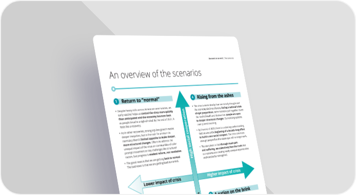 An event or an era? | The scenarios An overview of the scenarios 1 Return to “normal” 4 Rising from the ashes • Despite heavy tolls across American communities, an n • The virus is more deadly than we initially thought and early vaccine helps us control the virus more quickly the economy declines sharply. Facing a national crisis than anticipated and the economy bounces back tio of epic proportions, we’re forced to pull together. Given as people breathe a sigh of relief. By the end of 2021, it a the level of death and destruction, people are open feels like a recovery. r to deeper structural changes. Our existing systems e clearly aren’t working. • As in other recoveries, strong top-line growth masks p deeper inequities, but in the rush for a return to o • By the end of 2021, there is a sobering understanding o c normalcy there’s limited appetite to make deeper, that we are at the beginning of a decade-long effort l more structural changes. Efforts to address the a to build a new social compact. The crisis convinces unequal impact of the virus on communities of color ci enough people that the status quo will no longer work. prompt movement on key challenges like structural o s racism, but progress is modest reform, not revolution. • The story here is that through much pain h and suffering, we collectively face the truth that • The good news is that we are getting back to normal. g our systems are creating vastly unequal opportunities The bad news is that we are getting back to normal. Hi and need to be reimagined. Lower impact of crisis Higher impact of crisis n 2 Social fabric unraveled o 3 A nation on the brink i t a • New treatments help us begin to get the virus under r • The crisis worsens dramatically, and no one is coming control, and COVID-19 gradually becomes one more e to save us. As government aid dwindles and giving p “acceptable” risk we take as people return to work and oo collapses, the virus worsens, stifling any economic consumer confidence increases. c progress—with a particularly devastating impact l on communities of color and other marginalized • But the disproportionate impact of the crisis a i populations. on communities of color turns out to be part of a spark c that ignites long-standing powder kegs of inequality. The so • A scarcity narrative wins the day. There’s more economy and virus are relatively under control, but our demand for fewer resources. As municipal governments social fabric is unraveling. w go bankrupt, there are requests and later demands on • By the end of 2021, there is no collective narrative of the Lo philanthropy to fund social services and sustain public, crisis. Everyone holds their own truth and sees others civic institutions. as “villains.” Any cooperation is factional in nature and • By the end of 2021, it’s unclear if things will get better those with opposing views are seen as dangerous. or worse. Fringe views gain traction in the national debate and the “sensible center” all but disappears. 11
