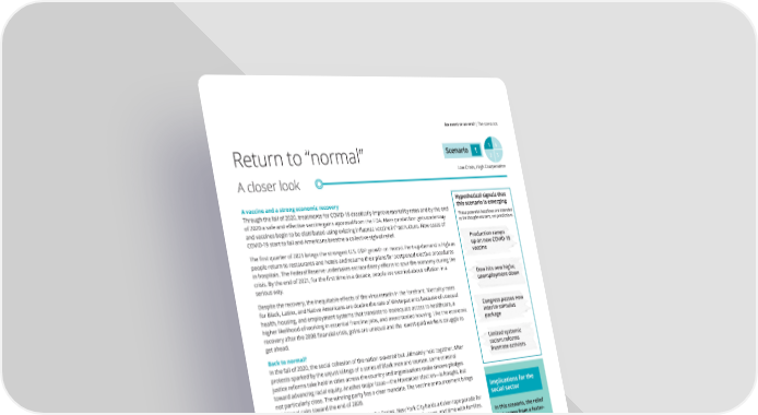An event or an era? | The scenarios Scenario 1 1 4 Return to “normal” 2 3 Low Crisis, High Cooperation A closer look A vaccine and a strong economic recovery Hypothetical signals that Through the fall of 2020, treatments for COVID-19 drastically improve mortality rates and by the end this scenario is emerging of 2020 a safe and effective vaccine gains approval from the FDA. Mass production gets underway These potential headlines are intended and vaccines begin to be distributed using existing influenza vaccine infrastructure. New cases of to be thought-starters, not predictions. COVID-19 start to fall and Americans breathe a collective sigh of relief. Production ramps The first quarter of 2021 brings the strongest U.S. GDP growth on record. Pent-up demand is high as up on new COVID-19 people return to restaurants and hotels and resume their plans for postponed elective procedures vaccine in hospitals. The Federal Reserve undertakes extraordinary efforts to spur the economy during the crisis. By the end of 2021, for the first time in a decade, people are worried about inflation in a Dow hits new highs; serious way. unemployment down Despite the recovery, the inequitable effects of the virus remain in the forefront. Mortality rates for Black, Latinx, and Native Americans are double the rate of White patients because of unequal health, housing, and employment systems that translate to inadequate access to healthcare, a Congress passes new higher likelihood of working in essential frontline jobs, and overcrowded housing. Like the economic interim stimulus recovery after the 2008 financial crisis, gains are unequal and the lowest-paid workers struggle to package get ahead. Back to normal? Limited systemic In the fall of 2020, the social cohesion of the nation wavered but ultimately held together. After racism reforms protests sparked by the unjust killings of a series of Black men and women, some criminal frustrate activists justice reforms take hold in cities across the country and organizations make sincere pledges toward advancing racial equity. Another major issue—the November election—is fraught, but not particularly close. The winning party has a clear mandate. The vaccine announcement brings additional calm toward the end of 2020. Implications for the By 2021, the mood is almost celebratory. In the Spring, New York City holds a ticker-tape parade for social sector healthcare workers. People look forward to a summer of travel, barbeques, and time with families. In this scenario, the relief Despite challenges, Federal and State governments ultimately work together and manage to that comes from a faster- provide enough support to help most families weather the storm. Unemployment insurance than-expected return to is extended, SNAP benefits temporarily increased, and emergency aid to small businesses normalcy undermines the continued. Communities work together as well, beginning to address the trauma and mental health opportunity to address consequences of the crisis. deeper inequities and 2021 is defined by modest reform rather than major revolution. However, by the end of the year, problems. Social sector a sense of complacency begins to set in. Many want to continue to push for deeper structural leaders will need to think reforms but find limited support for drastic changes. Corporations slowly drift back to prioritizing hard about interim solutions. shareholders over deeper community commitments. The good news is that things are back to Nonprofits will need to figure normal; the bad news is that things are back to normal. out how to temporarily adapt What funders and nonprofits face their fundraising, staffing, Although nearly 10% of nonprofits are forced to close their doors or shift to volunteer-led activities programs, and operations to during the crisis, many funders and nonprofits work together relatively well through the crisis by make it through until a new cutting red tape, more rapidly responding to community needs, and increasing unrestricted funding. normal emerges. Funders will Some work to lock in these gains, though other funders retrench, slowly rolling back emergency need to consider how they efforts and defaulting back to old practices after the crisis is perceived to be over. can best support grantees to help them weather the storm, Financial resources for nonprofits return to pre-crisis levels. Funding for leaders of color working while at the same time looking more “proximate” to communities increases somewhat as some funders intentionally redirect for opportunities to leverage resources, but levels still lag White-led organizations. Nonprofits looking to change systems face change before things begin to headwinds as complacency sets in. return to a new status quo. 13